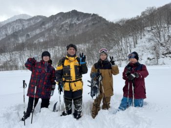 途中でスノーシューのベルトが切れてしまうハプニングもありましたが、小学性の男の子がラッセル隊長で先頭を歩いてくれたので、助かりました。