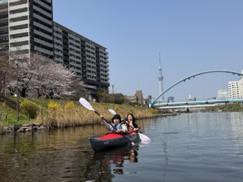 春の青空と桜の中で楽しむ、スカイツリーショートカヌーツアー